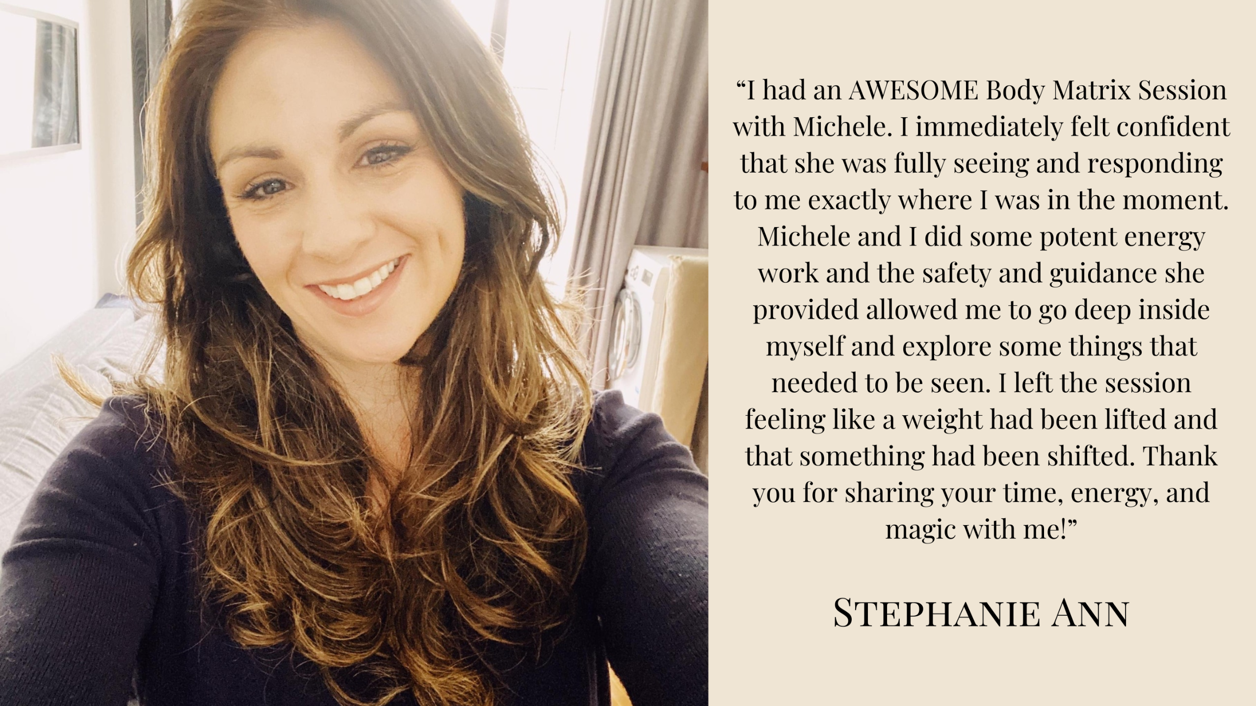 "I had an AWESOME Body Matrix Session with Michele. I immediately felt confident that she was fully seeing and responding to me exactly where I was in the moment. Michelle and I did some pretty potent energy work and the safety and guidance she provided allowed me to go deep inside myself and explore some things that needed to be seen. I left a session feeling like a weight has been lifted and that something has been shifted. Thank you for sharing your time, energy and magic with me!"